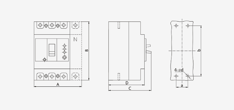 4: When this series of 3poles and 4poles circuit breakers are connected to single-phase loads, the phase wiring is connected to pole A, the neutral wiring is connected to pole C, not to pole B.